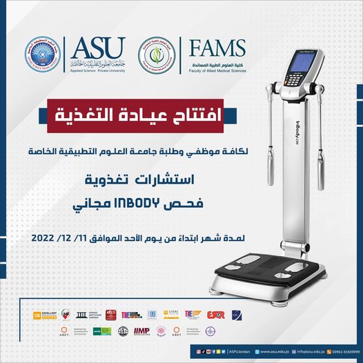 تعلن كلية العلوم الطبية المساندة/ قسم التغذية عن افتتاح عيادة التغذية لكافة موظفي وطلبة جامعة العلوم التطبيقية الخاصة والتي تقدم استشارات تغذوية وفحص InBody يوفر المعلومات التالية: