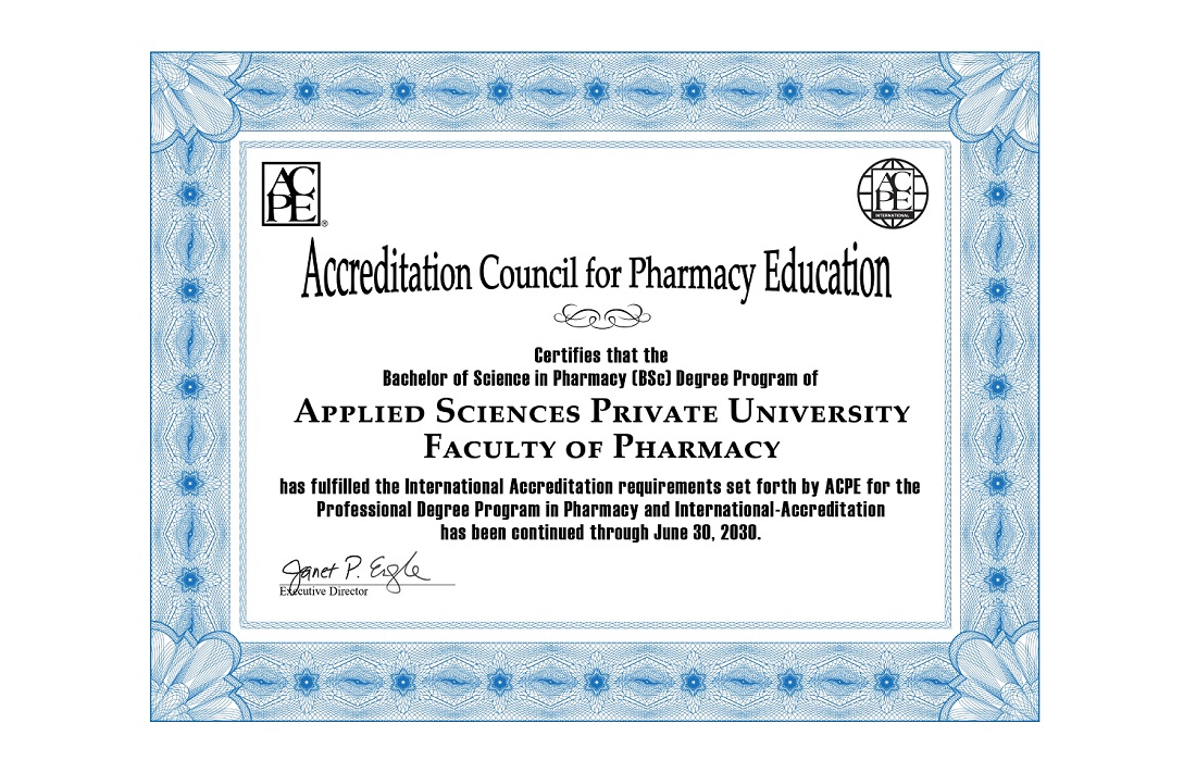 حصلت كلية الصيدلة بجامعة العلوم التطبيقية الخاصة على تجديد الاعتمادية الأمريكية ACPE لبرنامج البكالوريوس في الصيدلة لأطول فترة تعطى من الجهة المانحة وهي ستة سنوات، ويأتي هذا تأكيداً على التزام الكلية بأعلى معايير الجودة في مجال الصيدلة والتزامها أيضاً بجودة التدريس والتدريب بالإضافة لعقد الأنشطة اللامنهجية لإثراء تجربة الطلبة الجامعية وتوجيههم نحو التميز والإبداع.