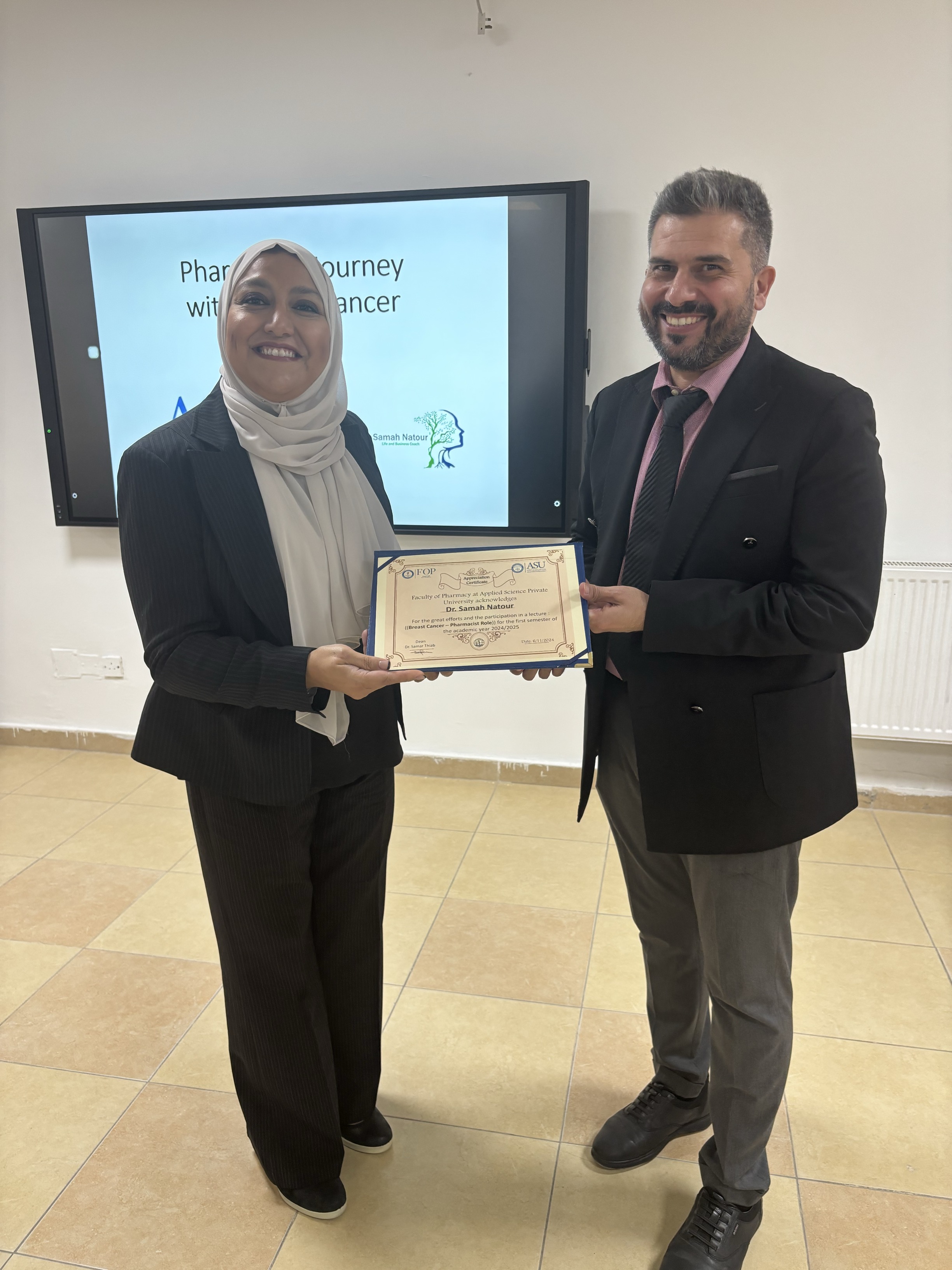 نتقدم بأسمى آيات الشكر والتقدير للدكتورة زهية أبو علوش وللدكتورة سماح الناطور على تفانيهما وجهودهما المستمرة في تقديم أفضل سبل الدعم والرعاية لمرضى السرطان. وكذلك لرئيس مجموعة الممارسة الصيدلانية، د.لؤي سعادة على جهوده في متابعة أحدث التطورات والأبحاث الطبية.