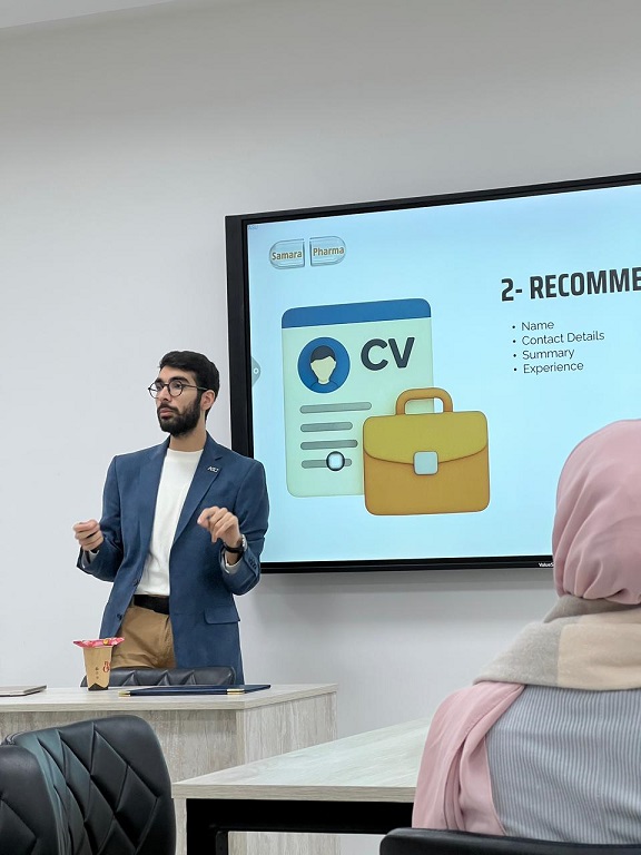 قدّم الورشة الدكتور سليمان عطية، مدير المستحضرات في الشركة الدوائية Samara Pharma، حيث اشتملت محاورها على استراتيجيات تطوير المسار المهني، وآليات تعزيز الجاهزية لسوق العمل، إضافة إلى الإرشادات المتعلقة بإعداد السيرة الذاتية والتميز في المقابلات الوظيفية.