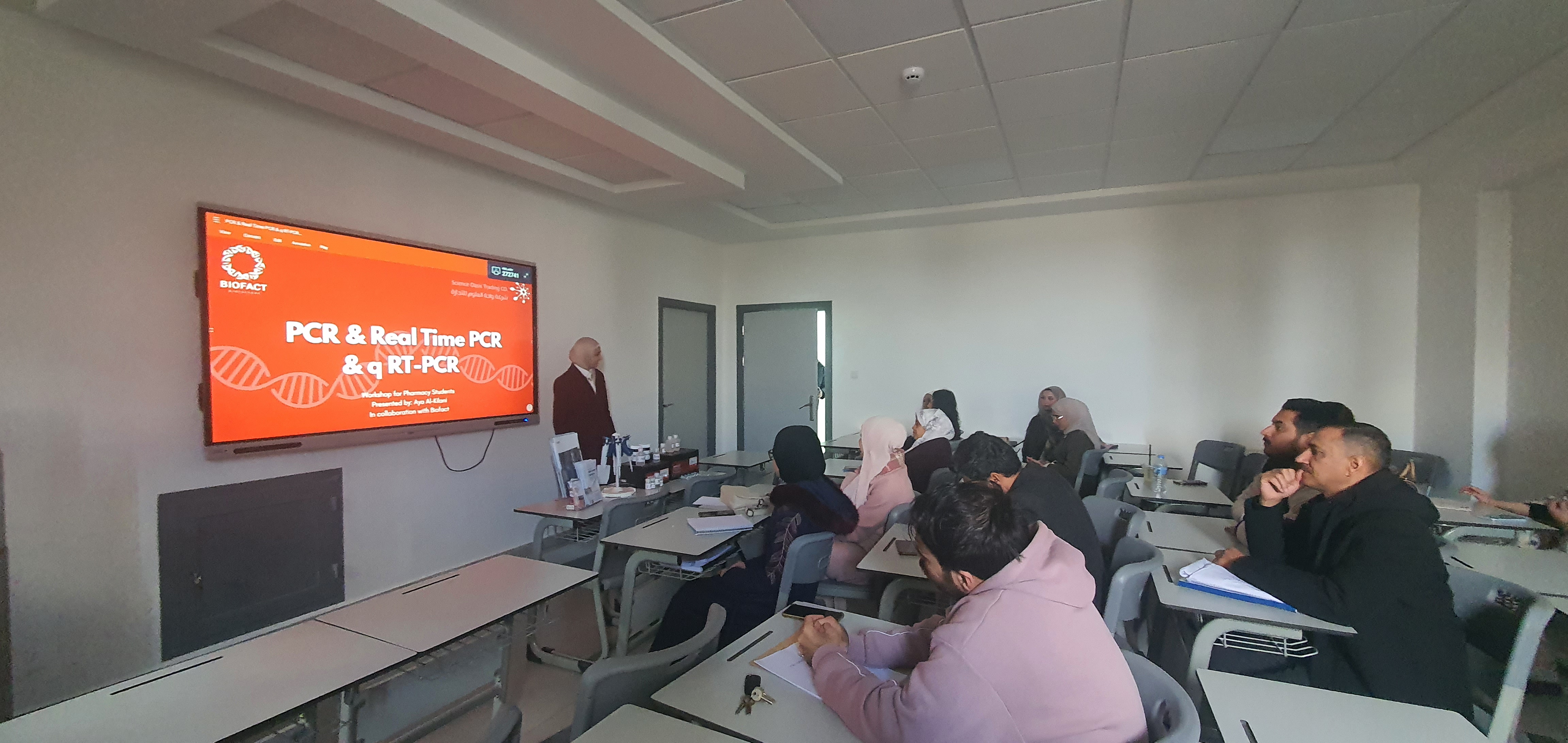 في خطوة مهمة لتعزيز التطبيقات العملية للتكنولوجيا الحيوية في تعليم الصيدلة، قُدِّمت محاضرة وورشة عمل متخصصة حول تقنية (PCR) قدمتها أ. آية علاء زيد الكيلاني-شركة واحة العلوم، ضمن مساق التكنولوجيا الحيوية الصيدلانية (907522)، وبإشراف منسقة المساق الدكتورة سماء طه عبد الله.