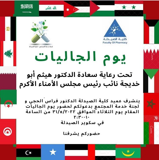 تحت رعاية د. هيثم أبو خديجة نائب رئيس مجلس الأمناء وحضور رئيس الجامعة ونائبها وعمداء الكليات نظمت لجنة خدمة المجتمع في كلية الصيدلة وبإشراف عميدها د. فراس الحجي ومقرر اللجنة د. منال عياش يوما مميزا لطلابها تحت عنوان "يوم الجاليات" وذلك استمرارًا لأنشطتها الطلابية والمجتمعية الهادفة تحقيقا لرؤية الكلية والجامعة.
