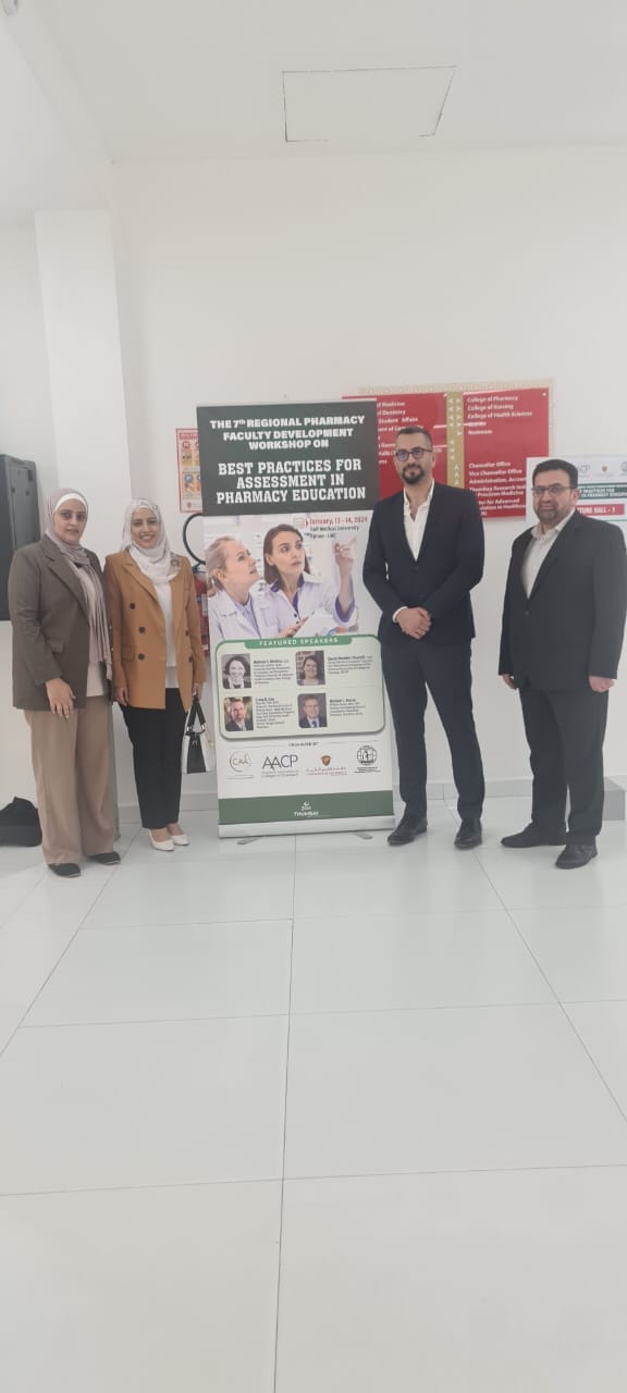 شارك وفد من كلية الصيدلة ممثلة بعميدها الدكتورة سمر ذياب وعميد البحث العلمي الدكتور محمد النجار والدكتور أمين عمر مساعد عميد كلية الصيدلة والدكتورة ريم أبو تايه رئيس قسم الكيمياء الصيدلانية والعقاقير ومقرر لجنة الخطة الدراسية في ورشة عمل اقليمية أقامتها جامعة الخليج الطبية في عجمان – دولة الإمارات العربية المتحدة، وبالتعاون مع مجلس الاعتماد للتعليم الصيدلاني والرابطة الأمريكية لكليات الصيدلة ومفوضية الاعتماد الأكاديمي.