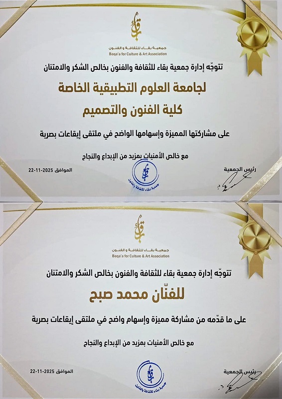 شاركت كلية الفنون والتصميم في جامعة العلوم التطبيقية الخاصة في ملتقى "إيقاعات بصرية" الذي تنظمه جمعية بقاء للثقافة والفنون، بمشاركة نخبة من الفنانين الأردنيين، بهدف تعزيز التبادل الفني والثقافي، ودمج الطاقات الإبداعية الجديدة مع التجارب الفنية المتنوعة. ومثّل الكلية في هذا الحدث الفني الأستاذ الفنان محمد صبح حيث قدّم مجموعة من الأعمال الفنية بأساليب حداثية متنوعة لاقت إعجاب الحضور، الذين أشادوا بتميزها وقيمتها الفنية.