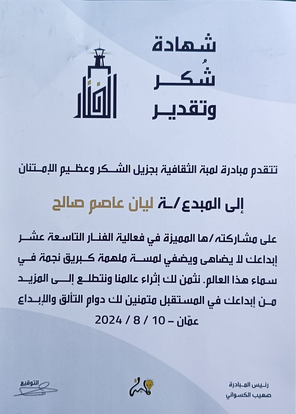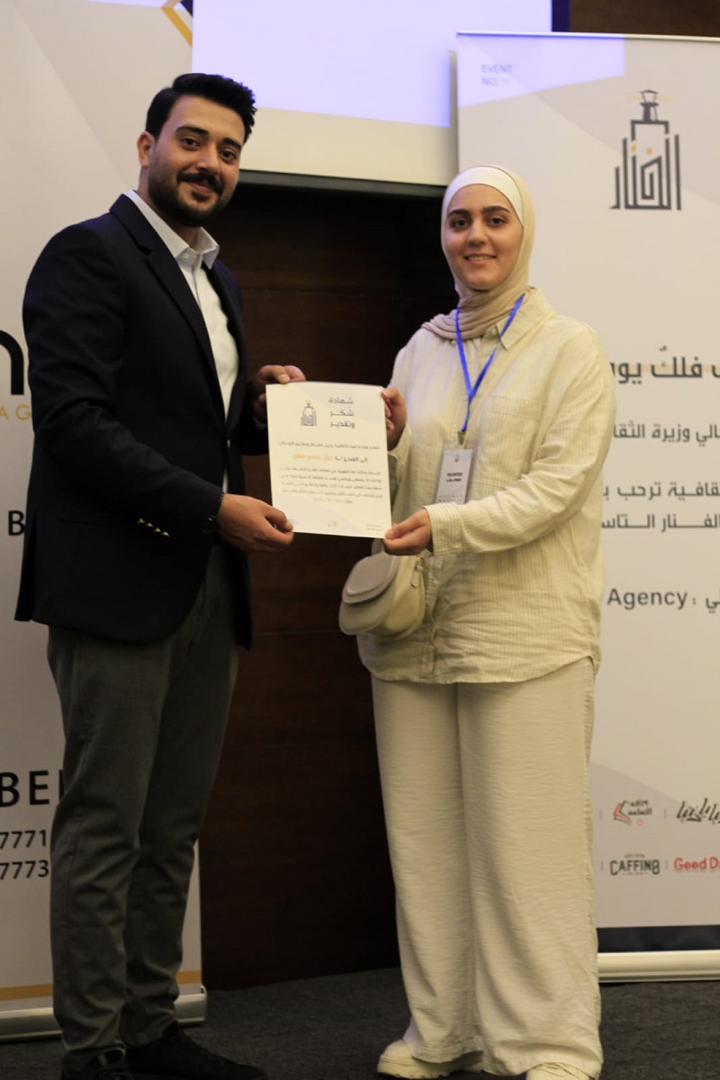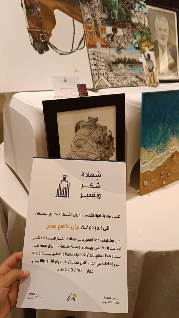 وشاركت الطالبة ليان صالح من كلية الفنون والتصميم في جامعة العلوم التطبيقية في هذا المعرض وحازت على الاعجاب الكبير بأعمالها المبدعة، وتم تكريمها لمشاركتها المتميزة.