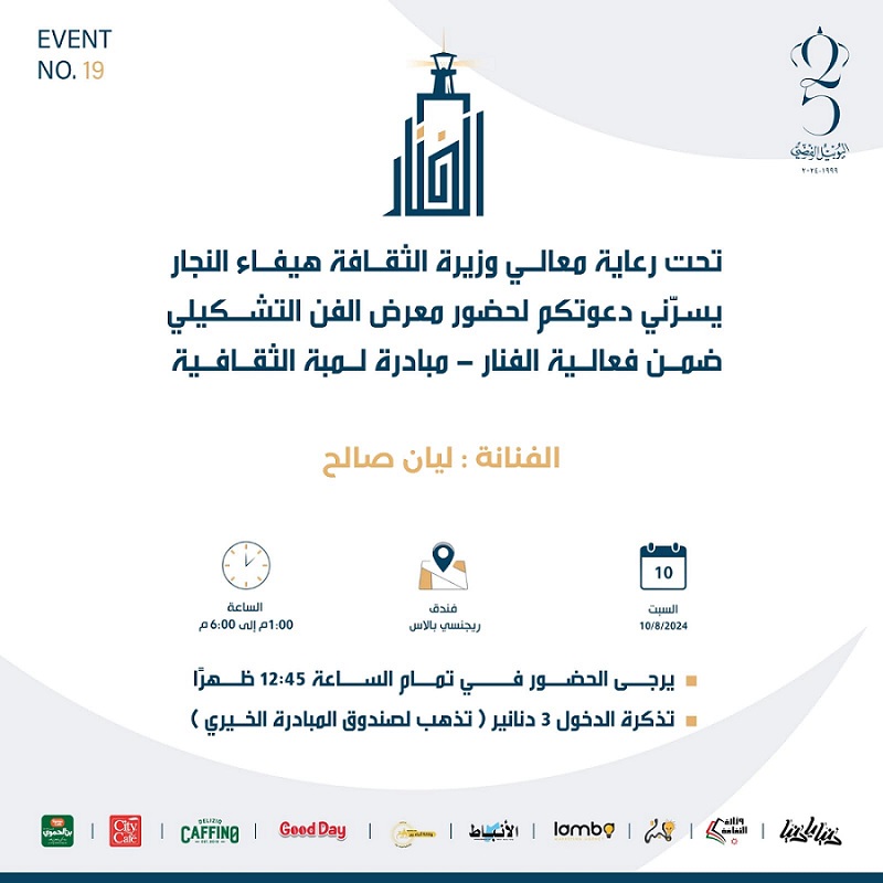 نظمت مبادرة "لمبة" الثقافية معرضاً للفن التشكيلي ضمن فعالية "الفنار" والتي أقيمت تحت رعاية معالي وزيرة الثقافة هيفاء النجار، وحضر مندوبًا عنها السيد أسامة الكسواني، مدير مديرية الشؤون الإدارية بوزارة الثقافة.