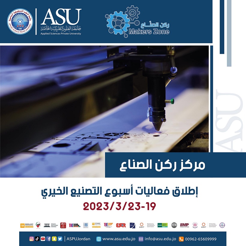 يعلن مركز ركن الصناع عن إطلاق فعاليات أسبوع التصنيع الخيري 19-23/ 3/ 2023، سيكون الافتتاح يوم الأحد الساعة 10:00، حيث سيتيح مختبر ركن الصناع للطلبة المتطوعين لتصنيع منتجات بواسطة أجهزة laser cnc وCNC router وvinyl cutter ثم سيقام بازار خيري لاحقاً يتم بيع هذه المنتجات من خلال هذا البازار وريع هذه المنتجات يوضع في حصالات حملة الجامعة في طرود الخير.