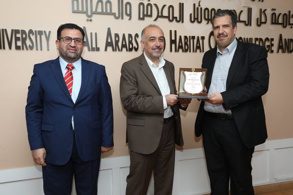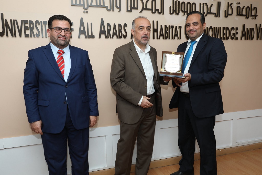 الدكتور عبد الله أحمد الخصيلات والدكتورة نور عيسى الهندي - جائزة الباحث الأكثر نشراً في قاعدة بيانات (SCOPUS) على مستوى كلية الحقوق.