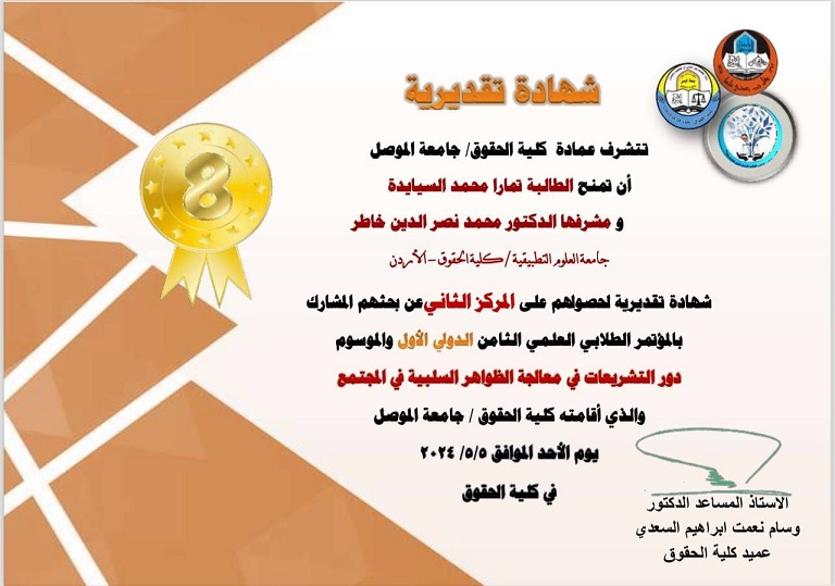 المشاركة بالمؤتمر الطلابي العلمي الثامن لكلية الحقوق في جامعة الموصل وإحراز المركز الثاني على مستوى الجامعات