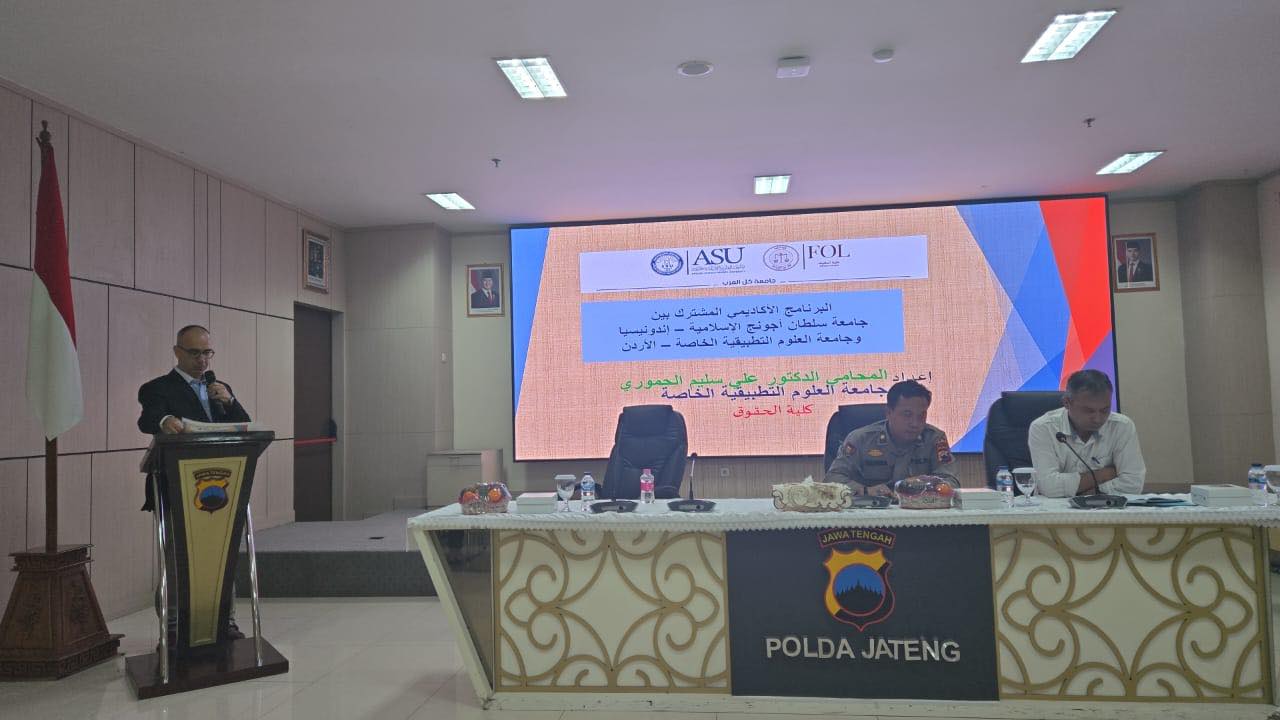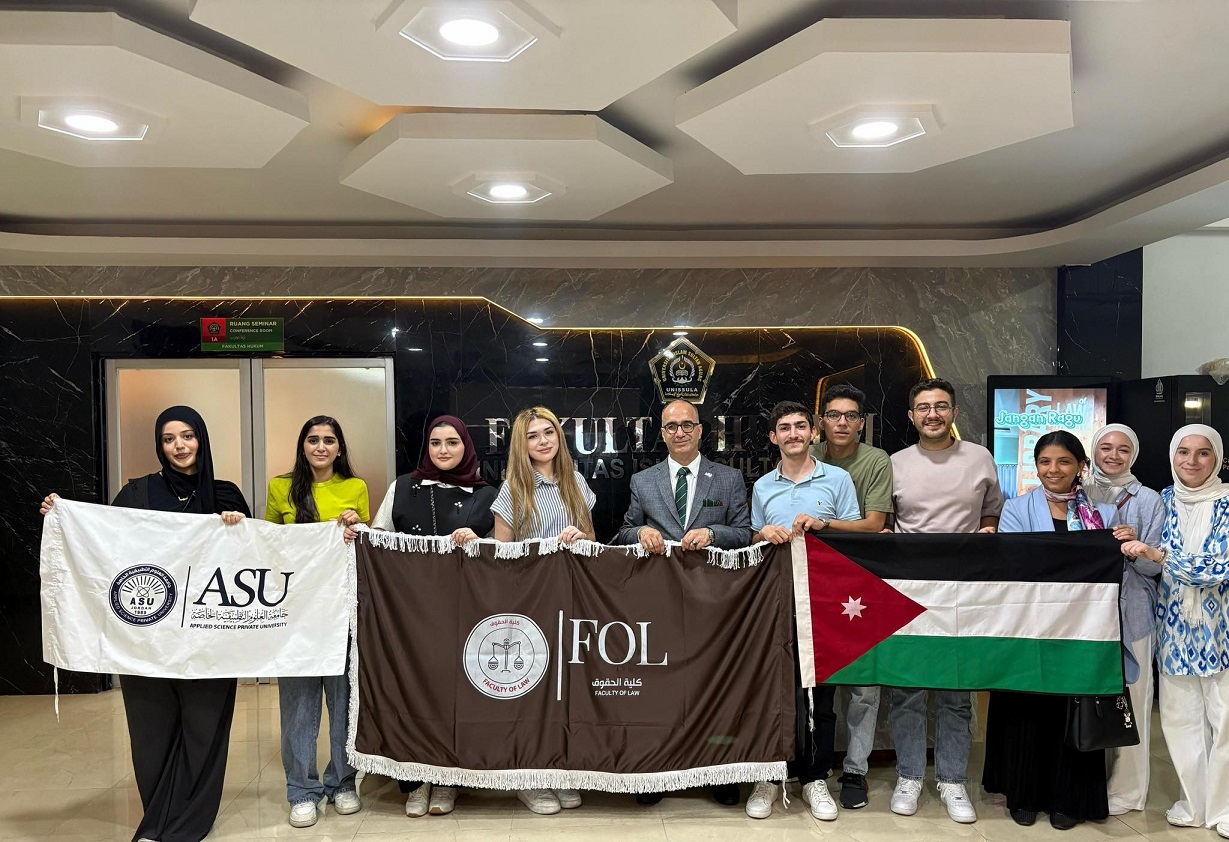 في إطار تعزيز التعاون الأكاديمي الدولي وتنمية مهارات الطلبة، شارك عدد من طلبة كلية الحقوق في جامعة العلوم التطبيقية الخاصة في برنامج علمي وتدريبي مكثف استضافته جامعة السلطان أغونغ الإسلامية في إندونيسيا امتد من تاريخ 2025/10/15 حتى تاريخ 2025/11/3. تضمّن البرنامج حضور محاضرات علمية متخصصة قدمها أساتذة دوليون، ومناقشات لطلبة الدراسات العليا، وزيارات ميدانية لعدد من المؤسسات القضائية والتشريعية، إلى جانب المشاركة في مبادرات لخدمة المجتمع المحلي. وقد أشرف على الطلبة الدكتور علي الحموري، واختُتم البرنامج بحفل رسمي شهد تكريم المشاركين وتبادل الدروع التذكارية بين الجامعتين.