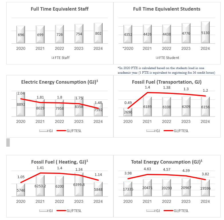 2 The university’s energy consumption, including heating, electricity, and transportation, has shown a noticeable decrease in recent periods. This reduction is mainly attributed to the shift toward offering a portion of courses online. This approach has reduced the need for full campus operations and minimized commuting by students and staff, leading to lower overall energy use and associated emissions.